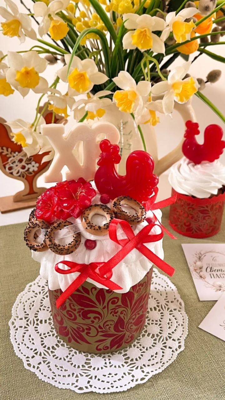 Украшен зефиром, мармеладом, баранками. Диаметр 9см
