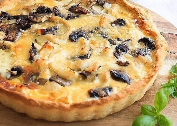 Песочное тесто, Курица шампиньоны , сливки , сыр, яйцо, соль.